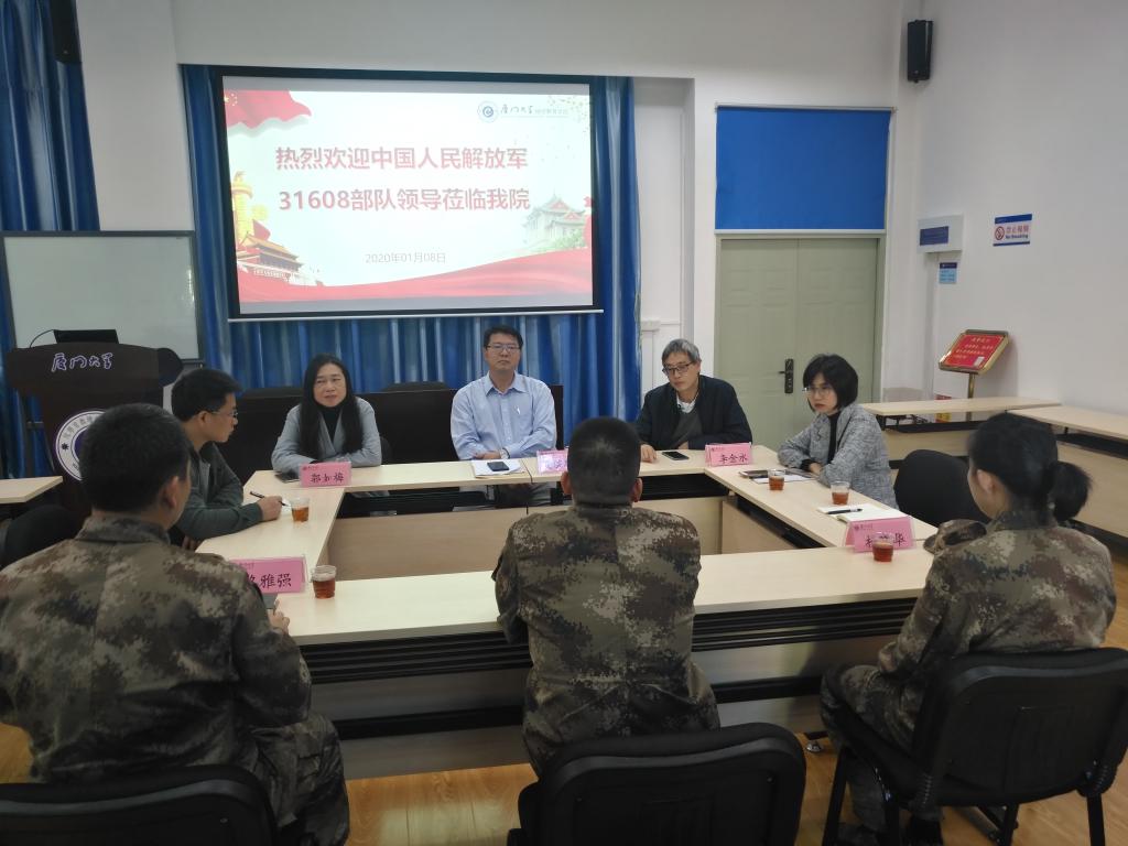 2020年1月8日下午15:30中国人民解放军31608部队政治工作部主任罗朝阳、保卫科科长路雅强、干事杨晓华一行来访我院,主要就“网络教育进军营,铸就士官大学梦”进行座谈交流。我院院长夏侯建兵、副院长郭如梅、教学部主任李金水,以及招生部和学生工作部相关老师出席座谈。