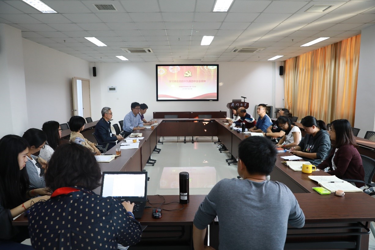 党总支书记邱旺土指出,党的十九届四中全会意义重大。学院要迅速行动起来,把学习宣传贯彻全会精神作为当前和今后一个时期的重大政治任务,及时进行传达、深入学习,`把此次学习作为一个契机,融入到学院正在开展的“不忘初心、牢记使命”主题教育中来,紧扣会议主题,聚焦重点内容,引导全院上下深刻领会、坚决贯彻落实。