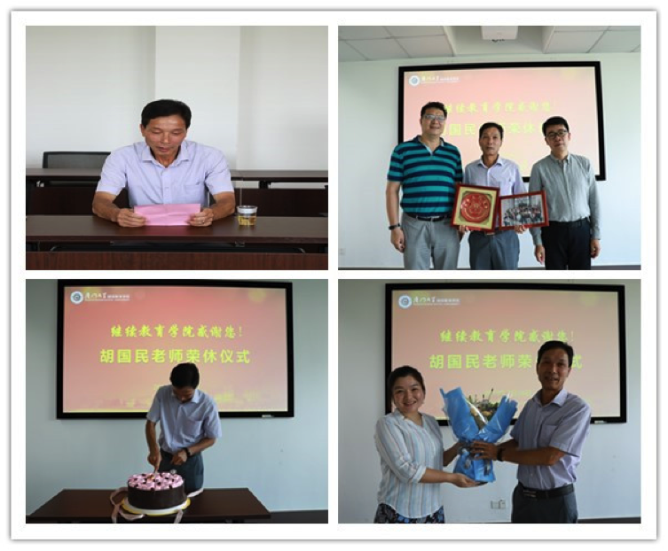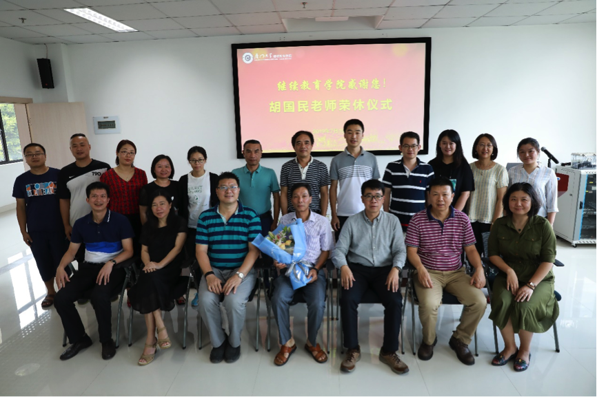 2019年7月19日下午,学院在A202会议室为即将退休的胡国民老师举行了光荣退休仪式,学院党政领导班子、相关部门人员、工会委员欢聚一堂,热烈欢送胡国民老师光荣退休,仪式由党总支副书记杨鸿飞主持。