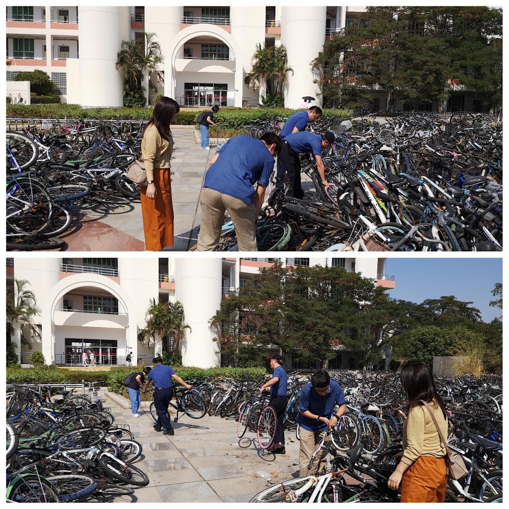 曾厝垵学生公寓教学楼是学校主要的教学场所之一,楼前广场除了是进出校园的主要通道,也是学校师生的课间休息休闲场所。长期以来,楼前广场堆放了大量的废弃自行车,加上环境卫生长期无人管理,呈现出脏乱差的形象。除了影响学校师生的出行,也严重损害了厦大美丽校园形象。因此,在繁忙的工作之余,党员老师利用11月5日午休时间,将楼前广场进行了整理和清理。烈日下,大家齐心协力将一辆辆废旧自行车整理摆齐,将堆积已久的废旧垃圾逐一清扫,把原本已经堵塞的步行通道逐步打通,终于清理出两条较为宽敞的步行通道,为师生营造了干净、整洁的学习环境。大家虽挥汗如雨,却毫无怨言,体现了党员的先锋模范作用,以实际行动践行了初心和使命。