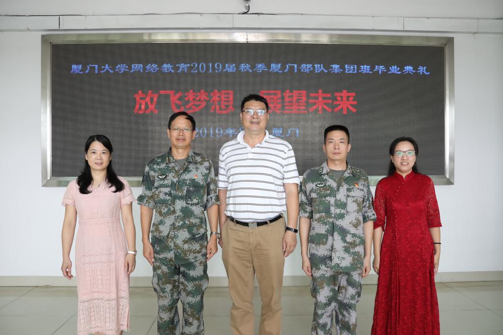 8月15日上午9时,厦门大学网络教育厦门直属学习中心在厦门灌口驻厦某部队演播大厅隆重举行201906届厦门部队集团班毕业典礼。厦门大学继续教育学院院长夏侯建兵、驻厦某部队政委郝康建、驻厦某部队政治工作部主任罗朝阳、驻厦某部队保卫科科长路雅强、厦门大学继续教育学院厦门直属学习中心主任厉旭光、部队集团班班主任卢幼平等领导、老师出席了毕业典礼。典礼由部队宣传干事陶欣主持。