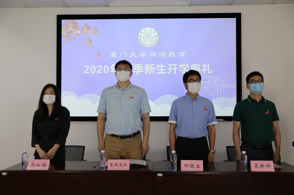 2020年5月10日上午,厦门大学翔安校区绿树成荫,百花争艳,厦门大学继续教育学院在南存钿楼A202报告厅隆重举行网络教育2020年春季新生“云”开学典礼。继续教育学院院长夏侯建兵、党总支书记邱旺土,副院长郭如梅,授课教师代表、建筑与土木工程学院吴新烨副教授出席典礼。全国各地学习中心的老师及新同学欢聚在屏幕前,同步观看“云”开学典礼。