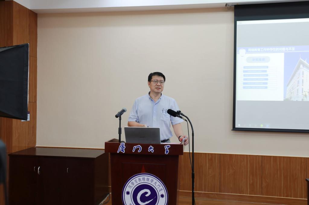 2020年7月23日下午,厦门大学网络教育2020年学习中心工作会议在海韵学生公寓教学楼404报告厅举行。在严格落实常态化疫情防控工作的基础上,为确保学院学历教育工作正常开展,本次会议采用远程视频的方式进行。学院院长夏侯建兵、党总支书记邱旺土、副院长郭如梅、黄明伟等全体党政领导出席会议,学院办学合作单位互联天下科技发展有限公司总经理张远明、弘成科技发展有限公司总裁丁向东、厦门大学网络教育各校外学习中心负责人及工作人员,以及学院相关部门主任和学历教育中心全体人员参加会议。会议由郭如梅副院长主持。