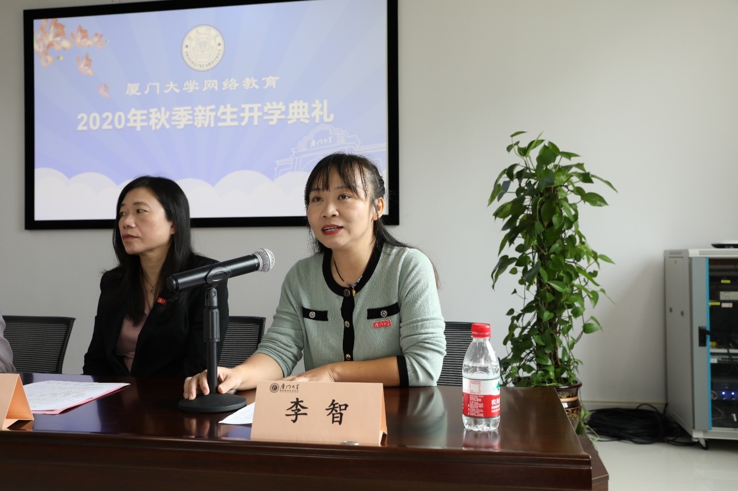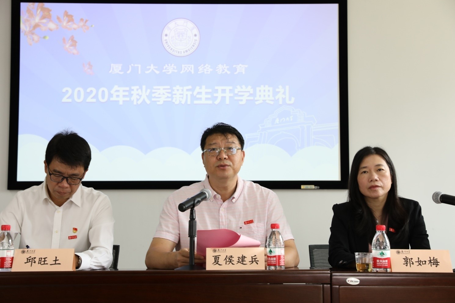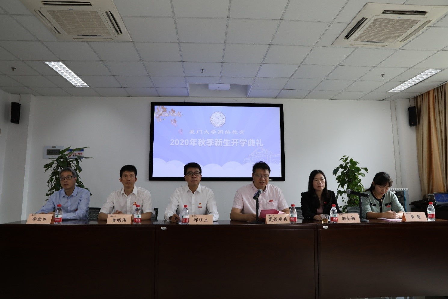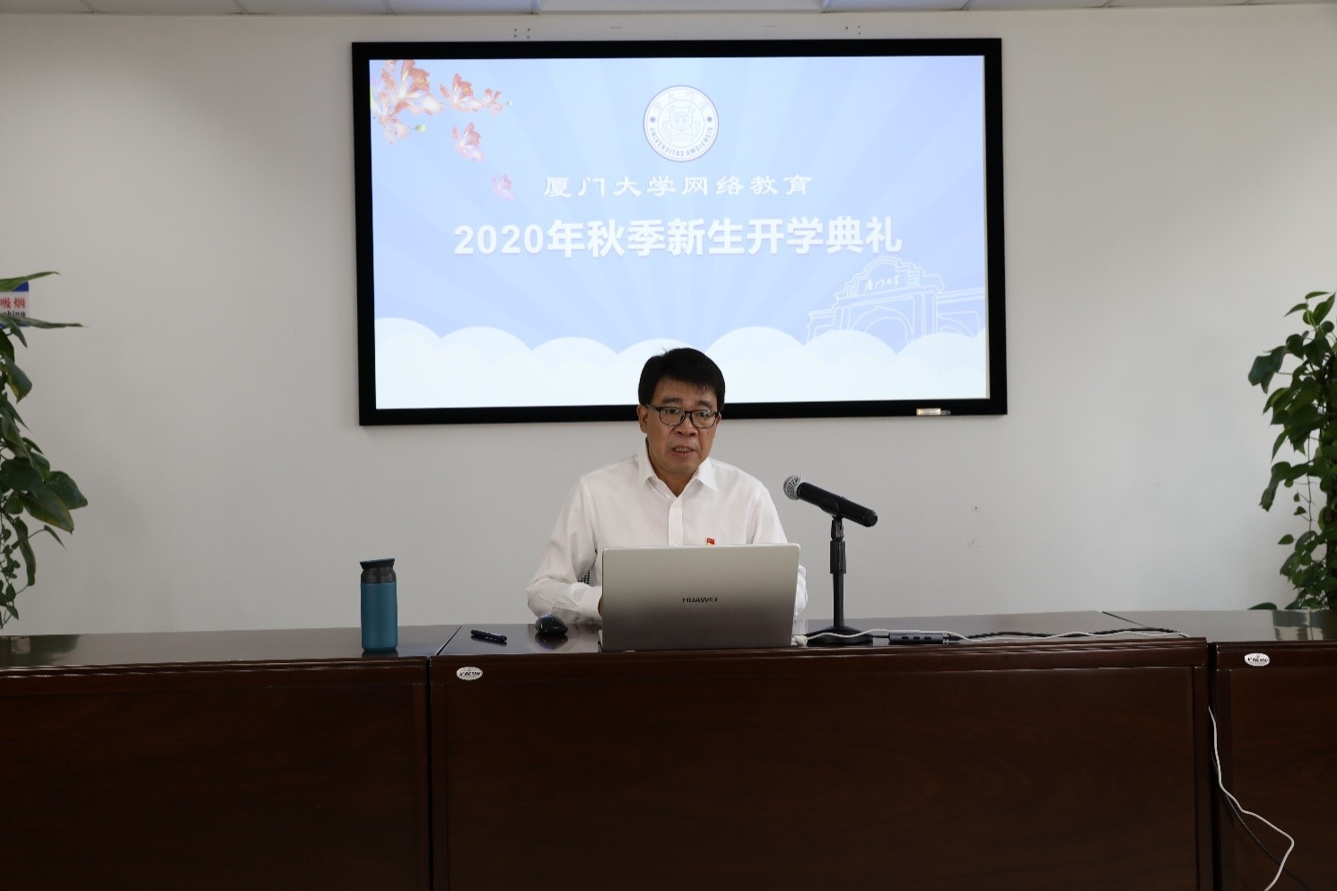 2020年11月14日上午,厦门大学继续教育学院网络教育2020年秋季新生“云”开学典礼在厦门大学翔安校区南存钿楼A202报告厅隆重举行。继续教育学院院长夏侯建兵,党总支书记邱旺土,副院长郭如梅、黄明伟,教师授课代表经济学院李智副教授出席典礼。全国各地学习中心的老师和新同学们欢聚在屏幕前,同步观看“云”开学典礼。