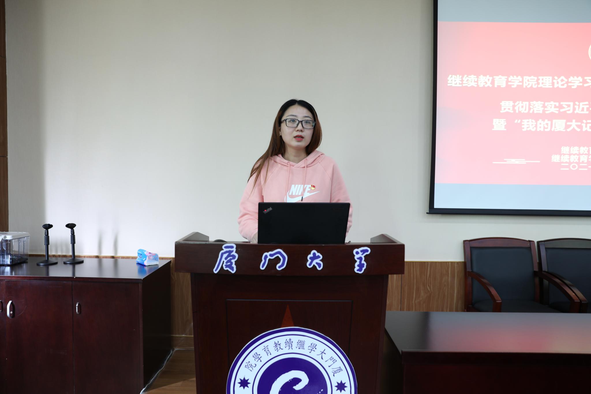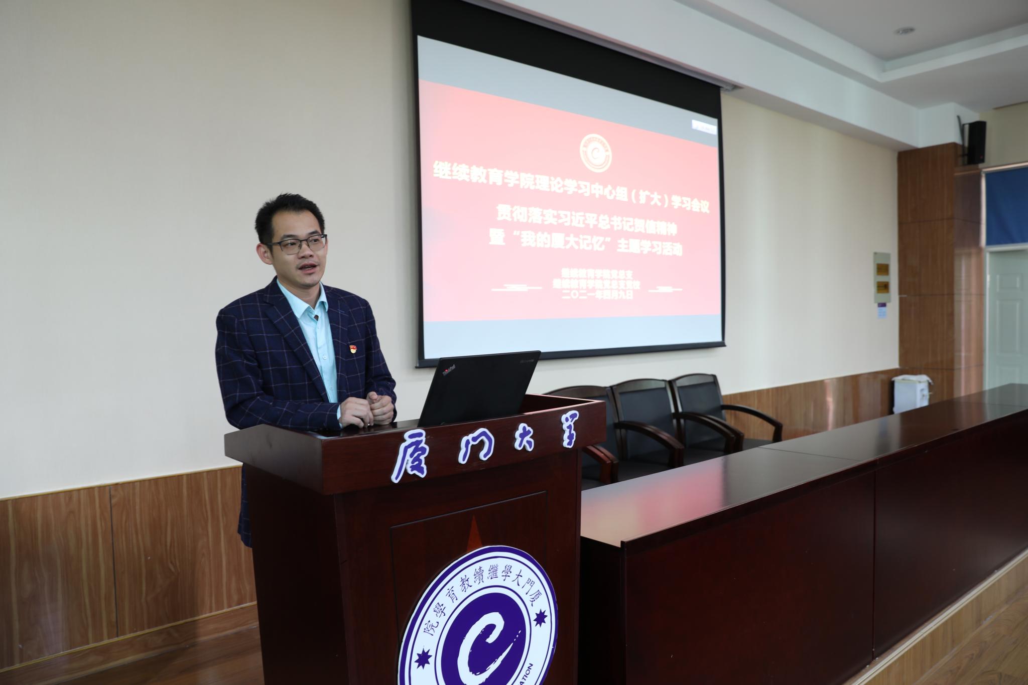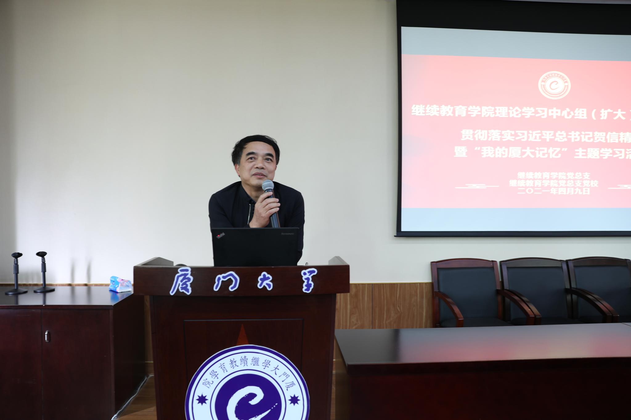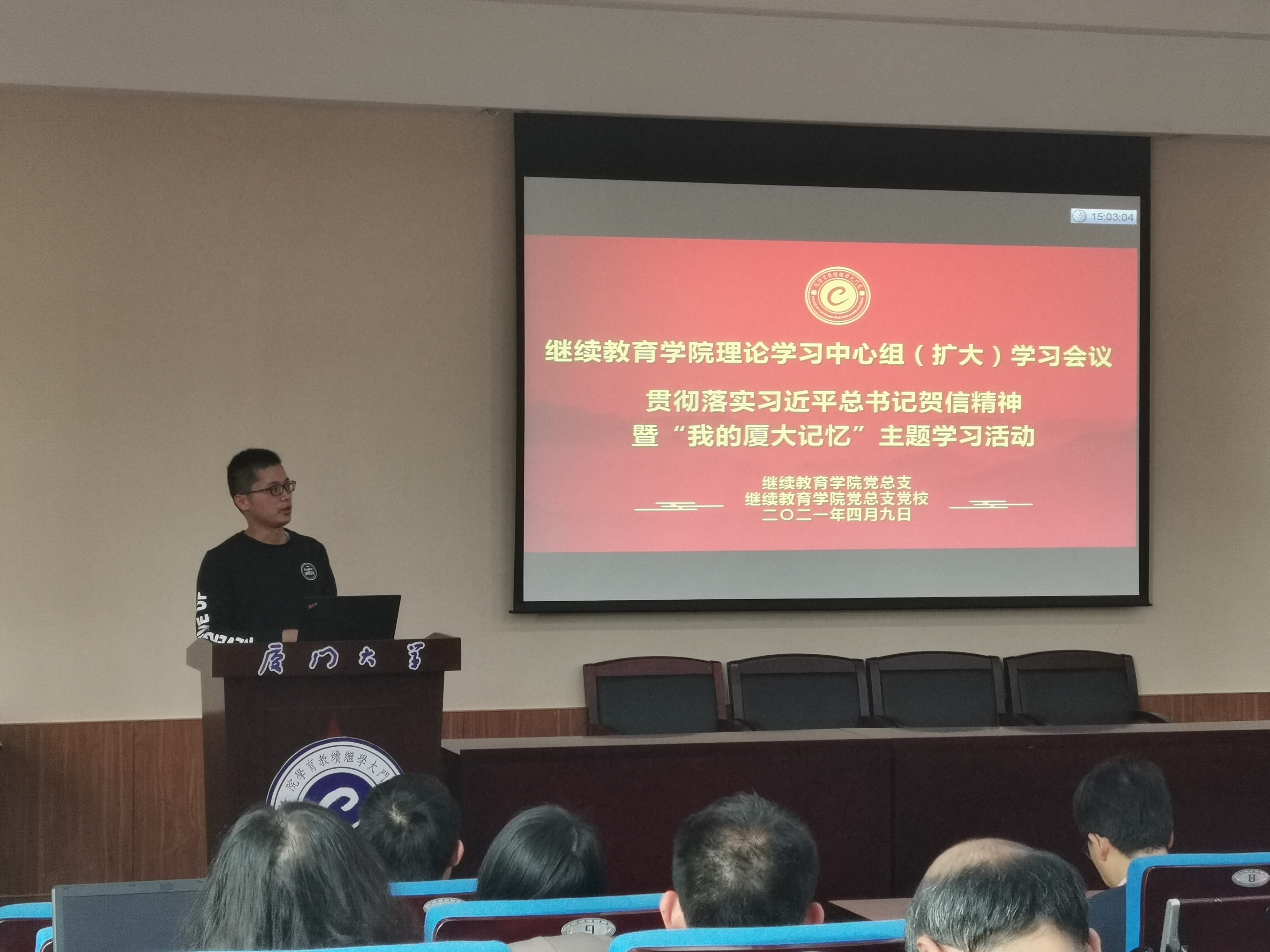 党总支书记邱旺土作学习总结。他指出,在厦大百年华诞之际,习近平总书记发来的贺信给全校师生带来了极大的精神鼓舞。百年厦大,凝结着一代又一代厦大人的奋斗记忆,承载着一代又一代厦大人孜孜不倦为教育事业奋斗终身的精神追求,开展此次主题学习,目的就是要激发起全体教职工在学习中汲取力量、在回忆中展望未来的奋斗意志。他强调,全院上下一定要认真学习贯彻习近平总书记贺信精神,牢记习近平总书记对学校未来发展寄予的殷切希望,在“自强不息、止于至善”的校训精神指引下,坚持把“立德树人”作为根本任务,坚持社会主义办学方向,发挥好学校履行社会服务职能的重要窗口作用,做大做强继续教育,为推动学校与时俱进建设“一流大学”贡献力量。
