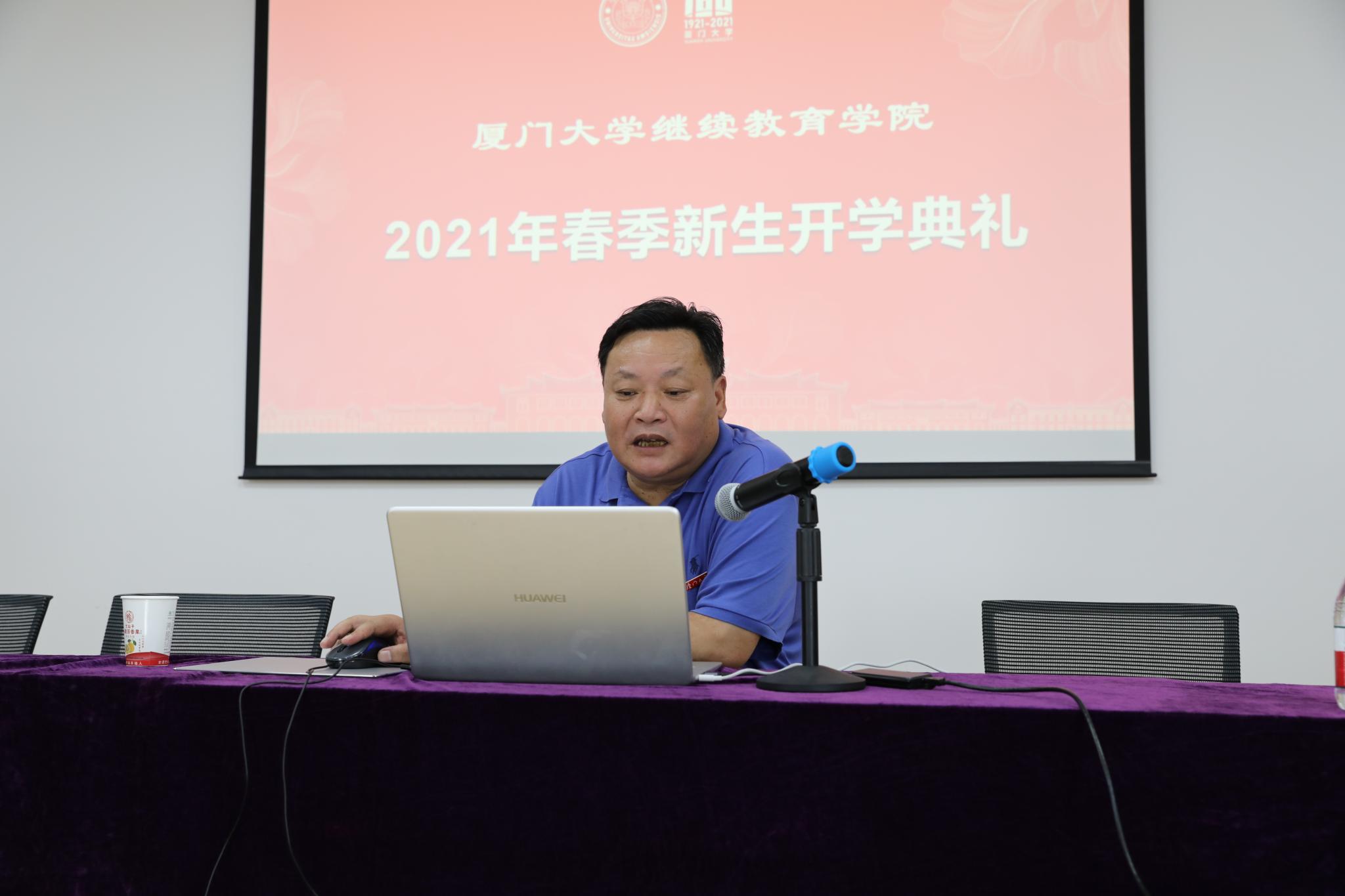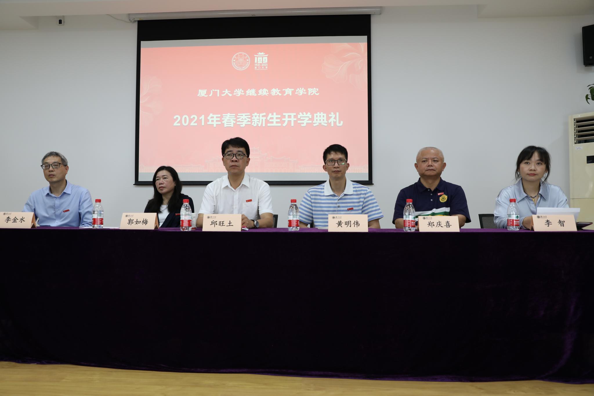 2021年5月9日上午,厦门大学继续教育学院网络教育2021年春季新生“云”开学典礼在学院306报告厅隆重举行。继续教育学院党总支书记邱旺土,副院长郭如梅、黄明伟、郑庆喜,学历教育中心主任李金水,授课教师代表经济学院副教授李智出席了典礼。学院校外学习中心的老师和2021年网络教育春季新生齐聚“云”端,通过直播形式观看开学典礼。