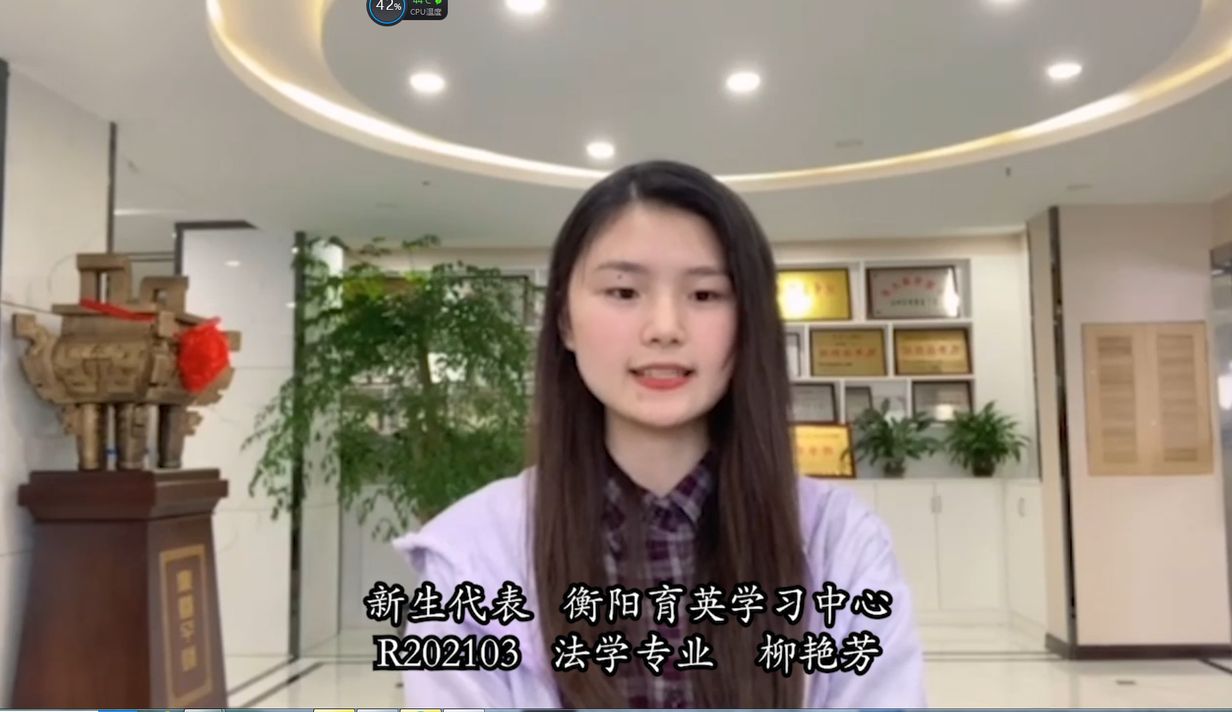 衡阳育英学习中心2021年春季法学专业的柳艳芳作为新生代表发言。她对自己能够进入厦门大学学习表示由衷的欣喜,同时希望和所有新同学一起学好专业知识,全面提高综合素质,争做发奋图强的“厦大人”。