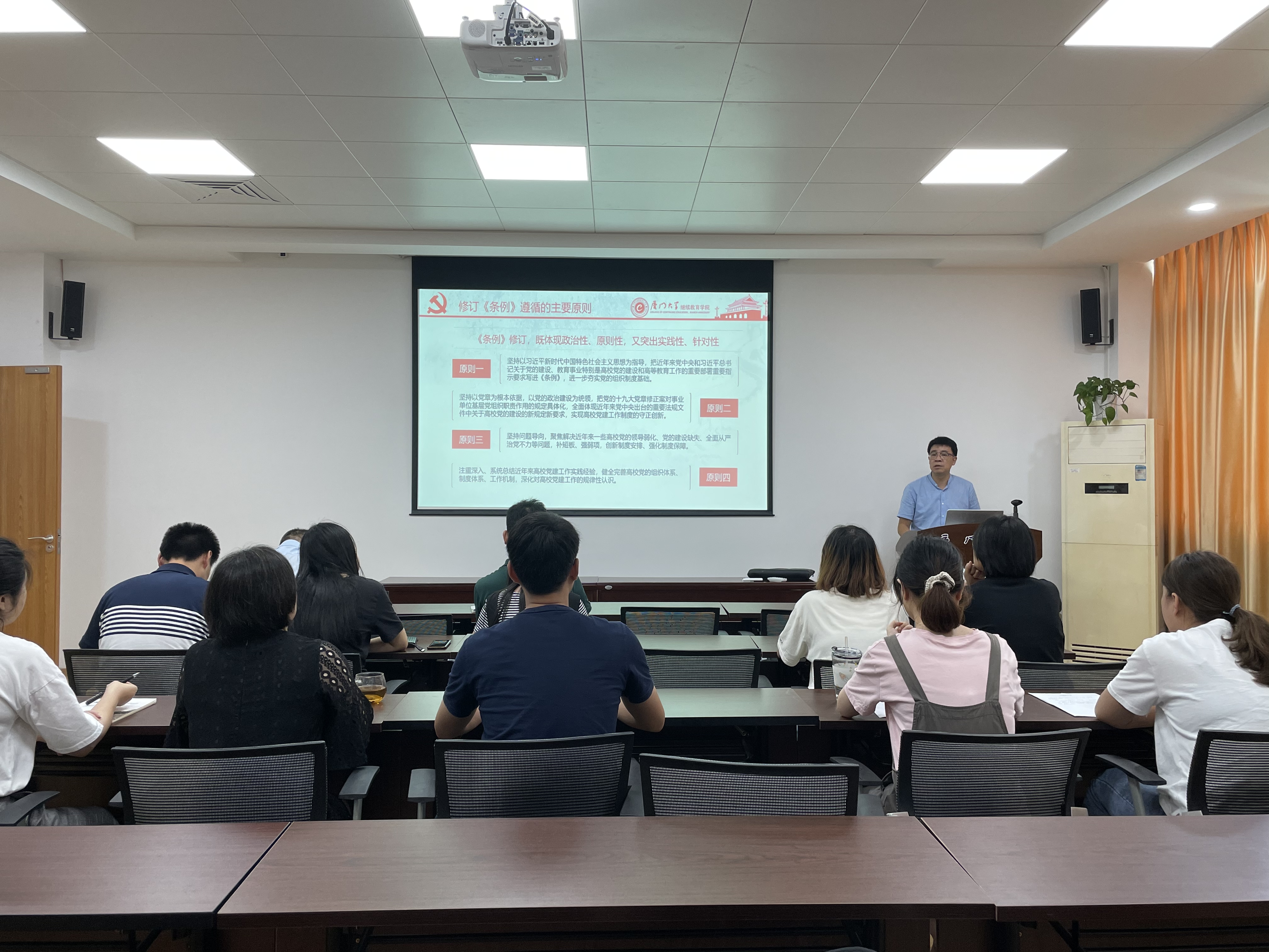 为进一步推进《条例》贯彻落实,确保学习全覆盖,5月28日,学院党总支党校组织全院党员在厦大海韵学生公寓二期食堂306会议室开展理论宣讲活动。学院党总支书记邱旺土同志担任宣讲人,以“学习新条例展现新作为”为主题,围绕条例修订的背景、过程、意义,修订条例遵循的基本原则,通过新旧条例对比讲解的方式,对新条例全文进行了解读。各支部通过“三会一课”“固定党日+”等制度自行组织开展《条例》学习,教育引导党员深入领会《条例》的主要内容和重要意义。