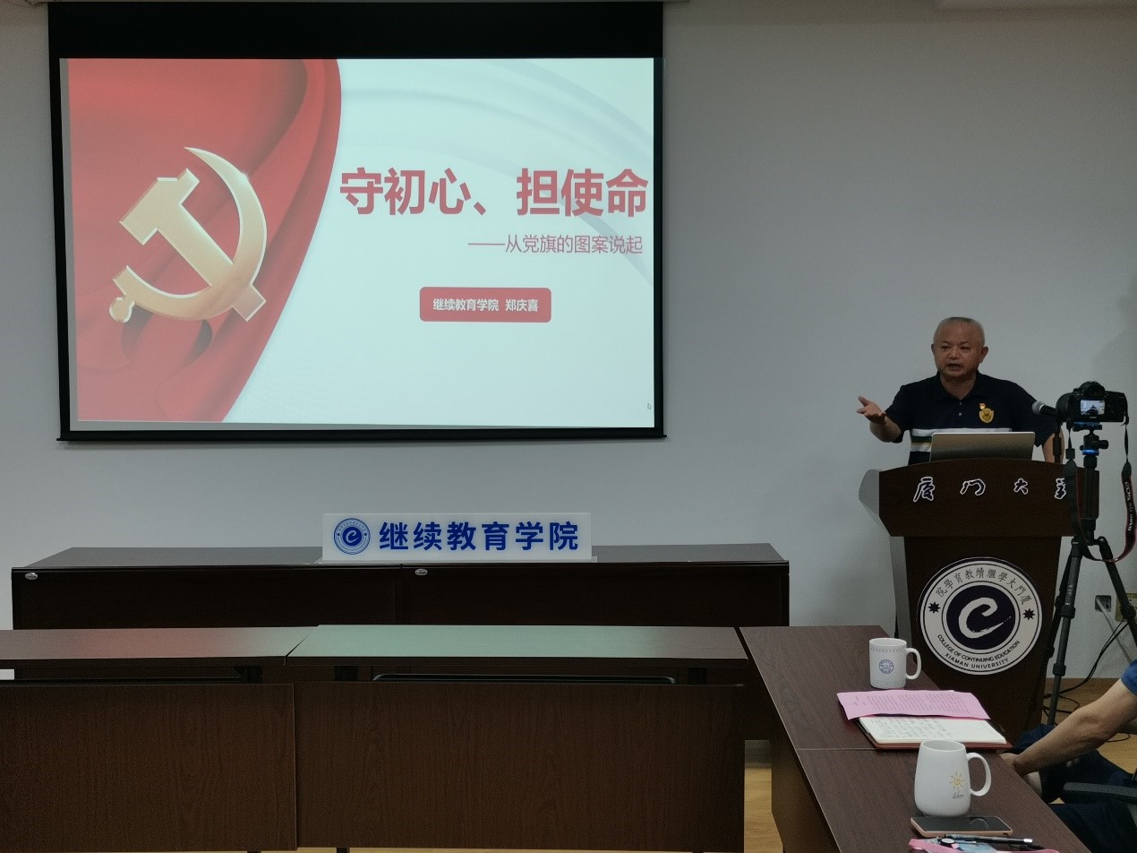 7月13日上午,继续教育学院“讲党课 学党史”第二期党课活动在厦大海韵学生公寓二期食堂306会议室召开。副院长郑庆喜作为本期授课人,为在职教职工第一党支部党员讲授《守初心,担使命——从党旗的图案说起》专题党课。
