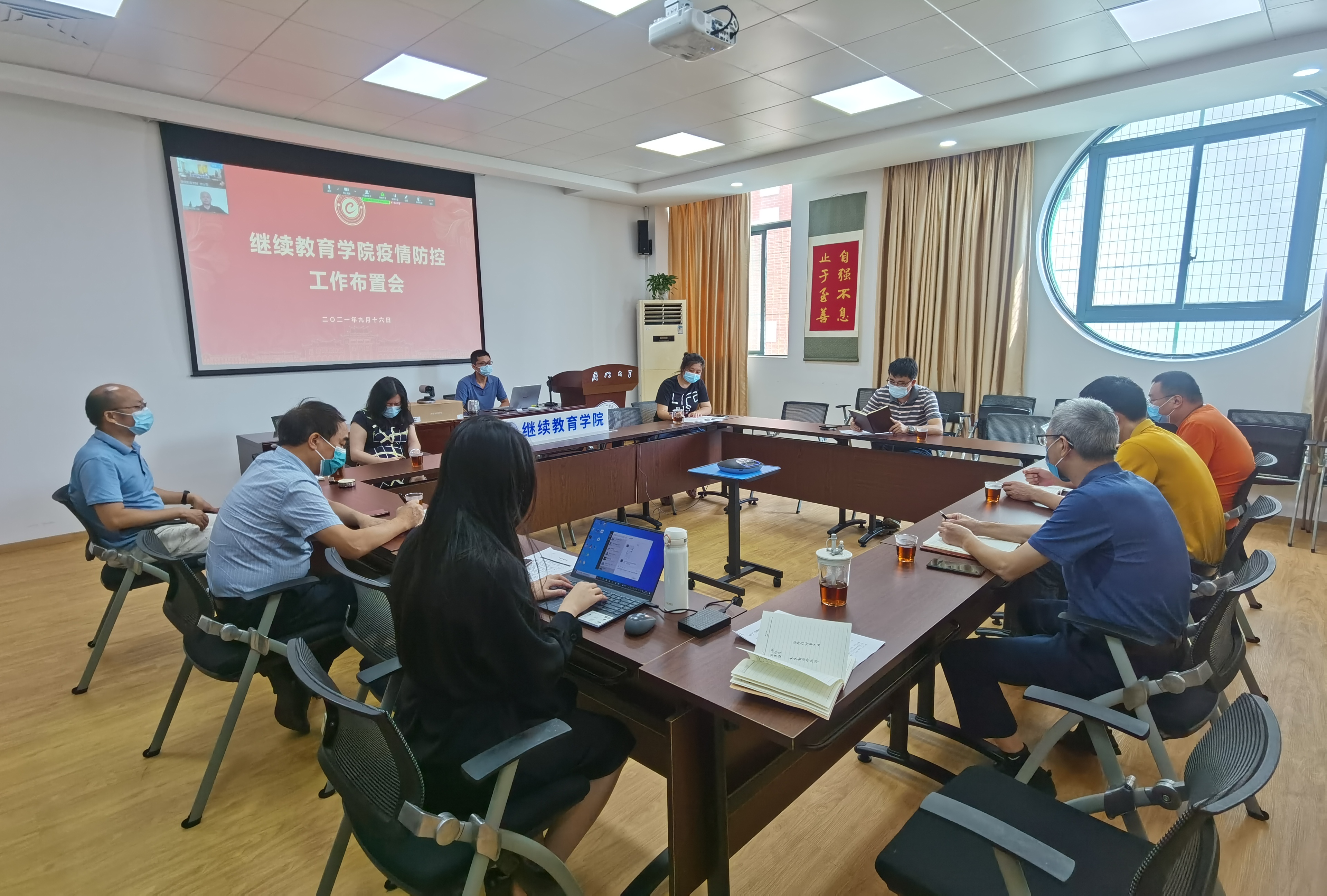 9月16日上午,继续教育学院在厦大海韵学生公寓二期306会议室召开疫情防控工作布置会,传达学校疫情防控工作布置会精神,部署当前阶段我院防控工作重点。会议以线上线下结合形式召开,学院疫情防控工作领导小组全体成员及疫情防控党员服务队全体成员参加了会议。党总支书记邱旺土主持会议。