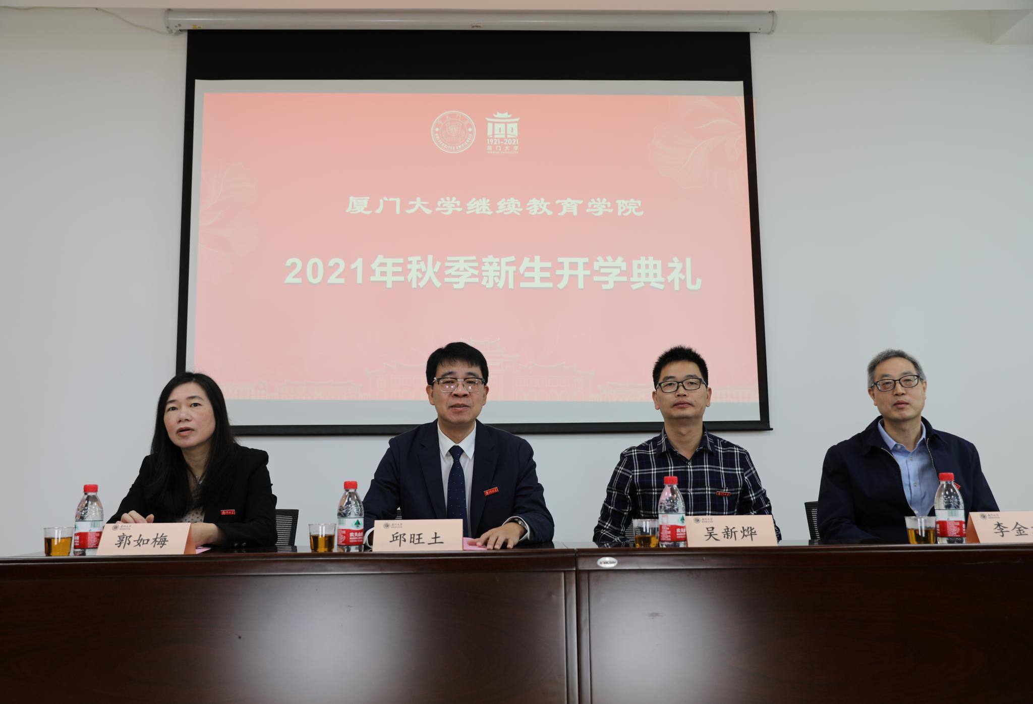 2021年11月13日上午,厦门大学继续教育学院网络教育2021年秋季新生“云”开学典礼在学院306报告厅隆重举行。继续教育学院党总支书记邱旺土,副院长郭如梅,学历教育中心主任李金水,授课教师代表建筑与土木工程学院副教授吴新烨出席了典礼。典礼由学院副院长郭如梅主持,学院校外学习中心的老师和2021年网络教育秋季新生齐聚“云”端,通过直播形式观看开学典礼。