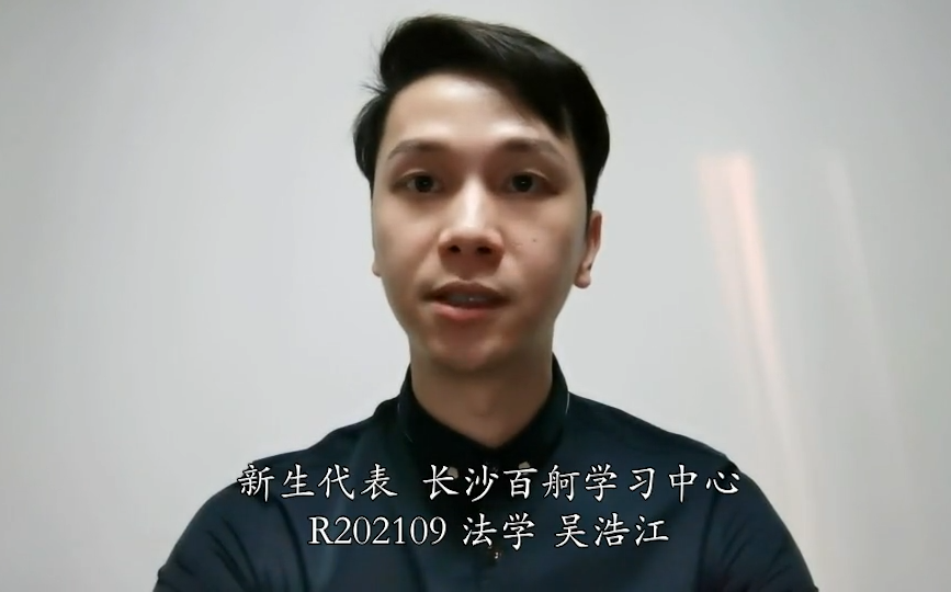 长沙百舸学习中心2021年秋季法学专业的吴浩江作为新生代表发言。他对自己能够进入厦门大学学习表示由衷的欣喜,同时他代表全体新生表示,会珍惜这个来之不易的继续学习机会,克服工学矛盾,严格要求自己,成为一名合格的“厦大人”。