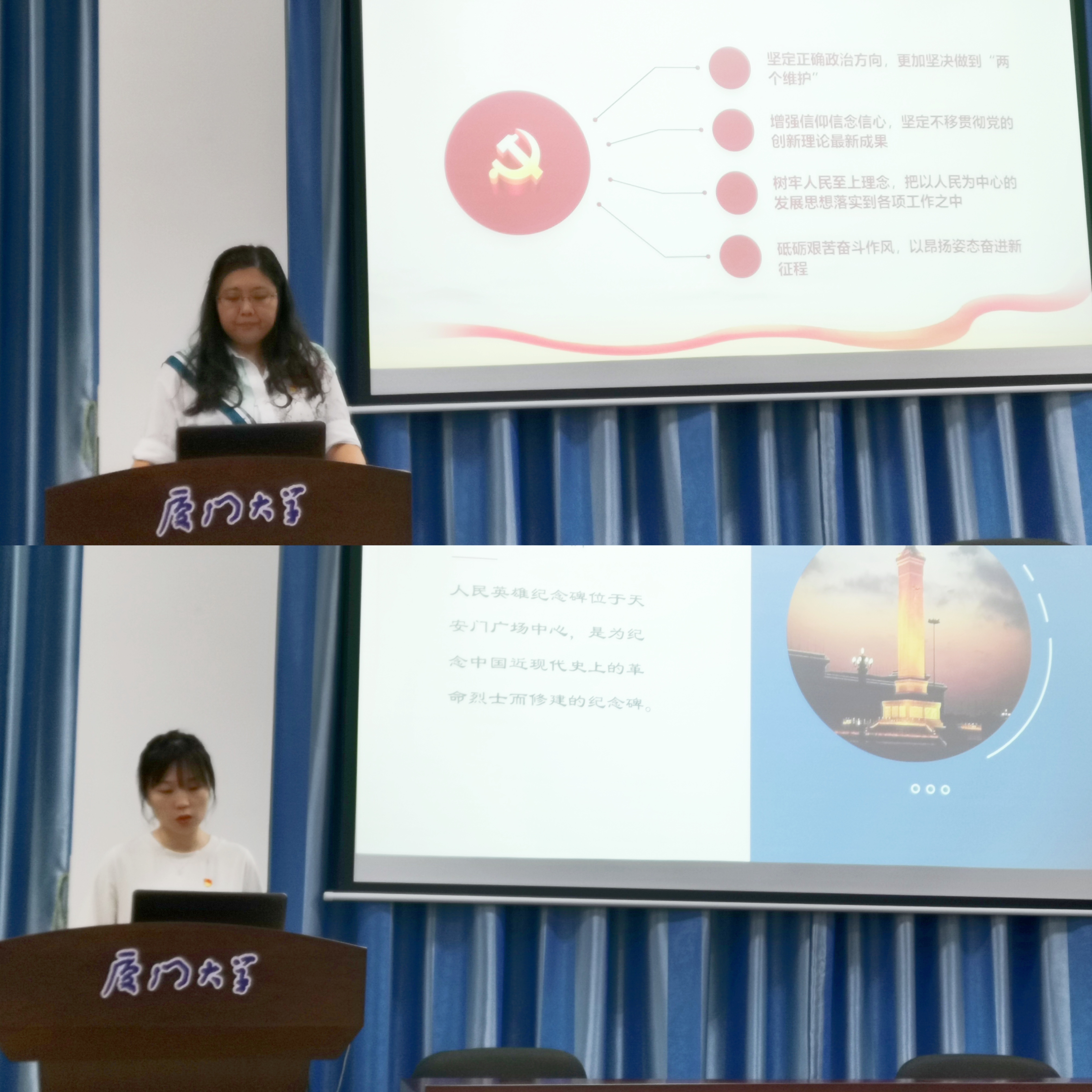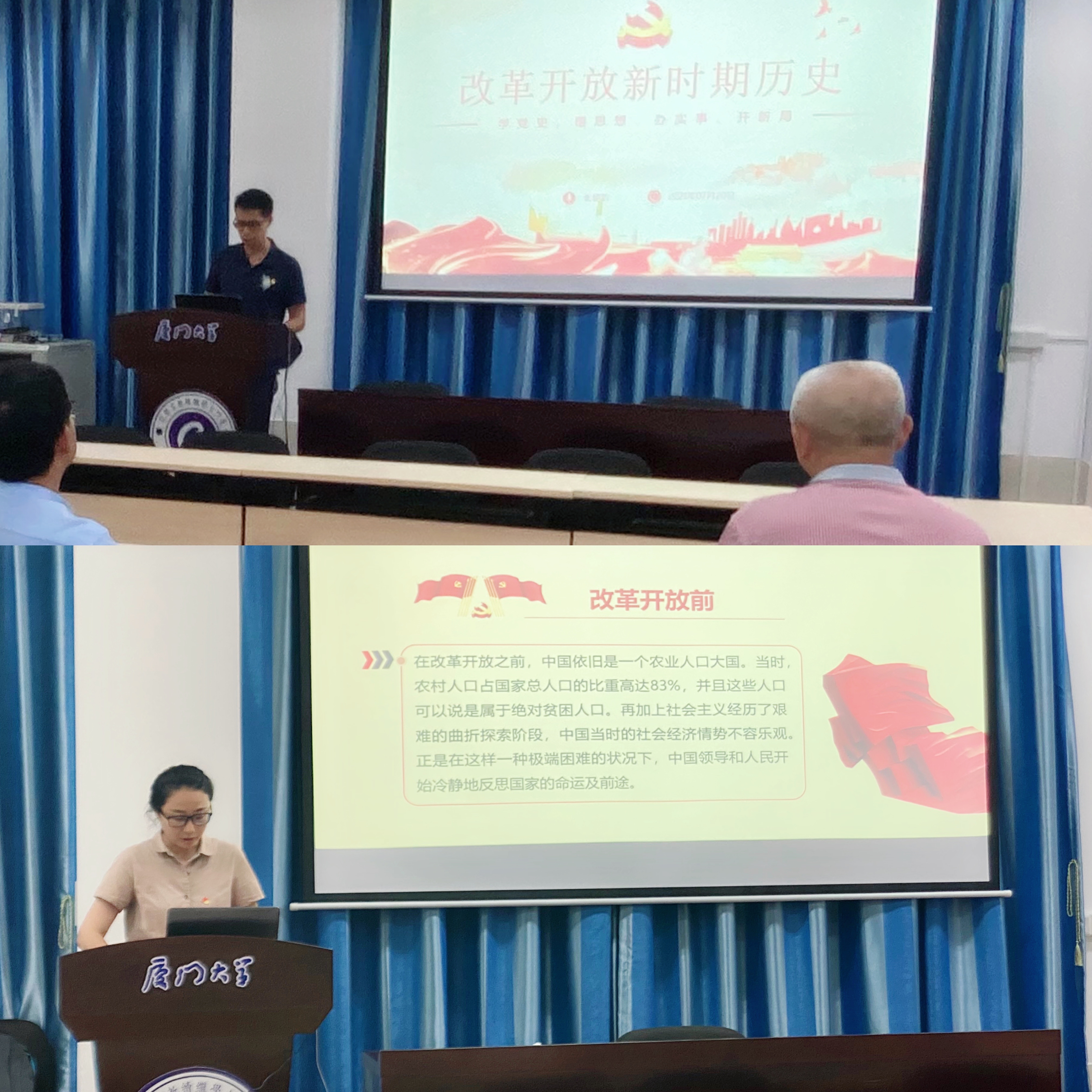 7月30日晚上,继续教育学院第八期“讲党课 学党史”党课活动在厦大海韵学生公寓教学楼102报告厅召开。学院2021年优秀共产党员肖佳、廖雪洁、张晓昕,优秀党务工作者赵丹丹等4位同志作为党课主讲人,为在职教职工第二党支部全体党员讲授了《革命旧址云上展:杨家岭革命旧址—学习延安精神》《新民主主义革命的性质、实质》《改革开放新时期历史》《“四史”学习教育之改革开放史》的专题党课。