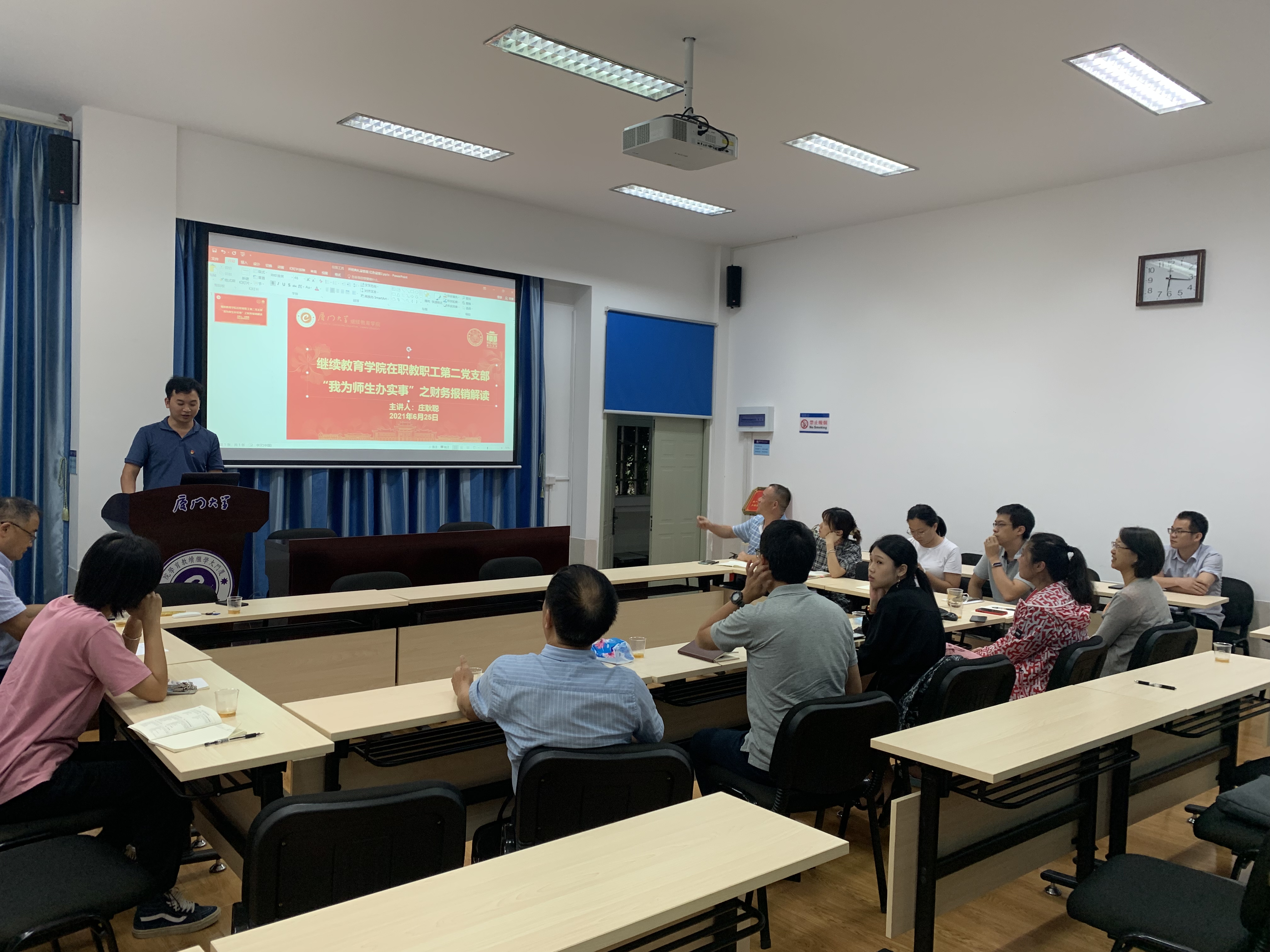 为隆重庆祝中国共产党成立100周年,深入贯彻落实习近平新时代中国特色社会主义思想,推动党史学习教育走深走实,6月25日下午,我院在职教职工第二党支部在厦大海韵学生公寓教学楼102报告厅,组织开展了“我为师生办实事”主题活动,邀请支部党员庄耿聪老师为学院办公室、非学历教育中心全体教职工讲解日常报销相关问题,从实际工作需求出发,为大家办实事、解难题。