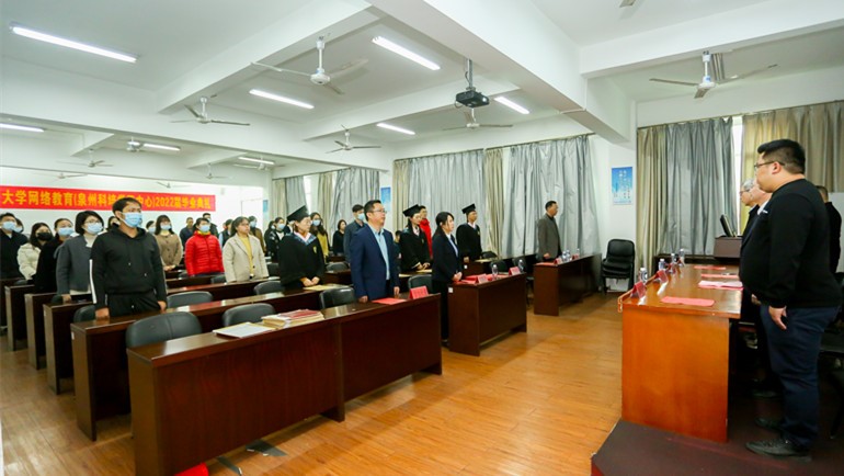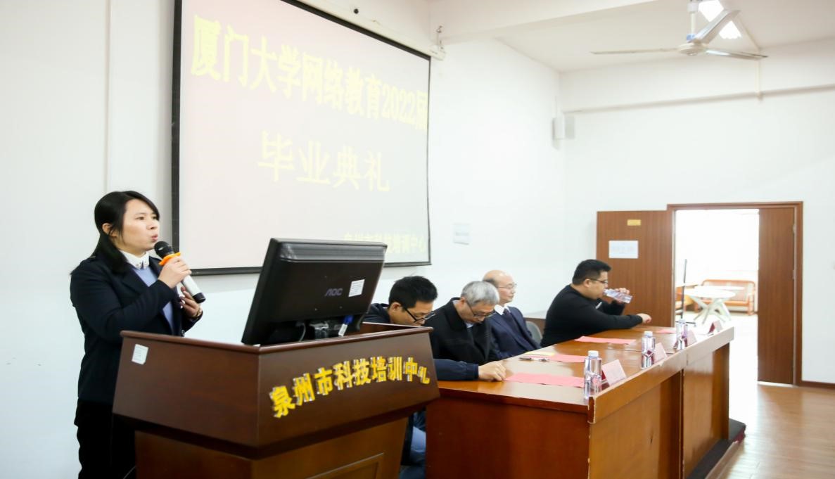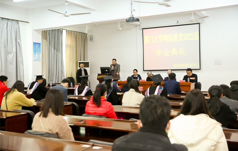 2022年1月16日上午,厦门大学网络教育泉州科培学习中心隆重举行了2022届毕业典礼。厦门大学特聘教授,厦门大学继续教育学院院长朱孟楠、厦门大学继续教育学院学历教育中心主任李金水、招生部负责人纪智坡等出席了典礼。典礼由张标贤老师主持。