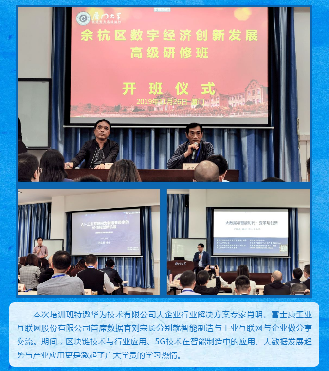 为进一步强化首席信息官和智能制造服务商的合作联系,共同在产业数字化、数字产业化的融合发展上发挥更大作用。余杭区经信局委托我院承办余杭区数字经济创新发展高级研修班。11月26日上午,培训班在公寓教学楼102报告厅开班。余杭区经信局副局长张坚强、我院培训部主任孙锦水出席开班式。来自余杭区10家数字化改造服务商,31家制造业企业首席信息官,共41人,参加本次培训班。