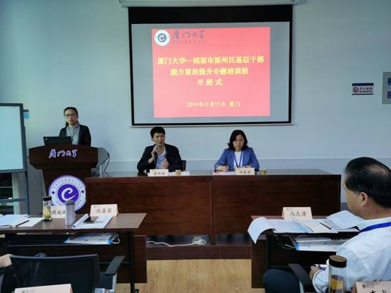 2019年11月11日上午来自固原市原州区基层干部能力素质提升的50位学员在厦门大学曾厝垵学生公寓教学楼402教室参加开班典礼,厦门大学继续教育学院副院长黄明伟同志、固原市原州区委组织部副部长刘喜荣同志出席开班仪式。