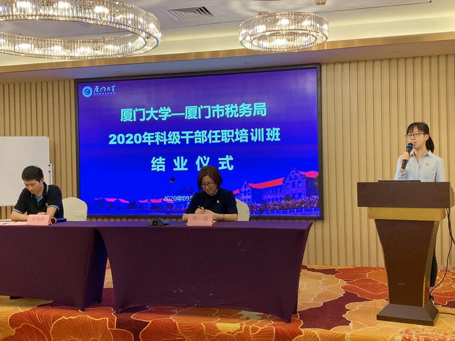 在9月29日下午的结业仪式上,林翊副处长感谢厦门大学继续教育学院一如既往的支持,并对学员提出了新的要求。她说,述学是厦门税务培训的一块品牌,是很好的学习方法,希望学员们将它带回各自的工作岗位,提升部门的学习能力,并激励全体学员在新平台上加油干,共同缔造厦门税务更美好的明天!黄明伟副院长大力肯定了学员们的业务述学活动,认为这是一种很新颖管用的学习手段,今后可以在教育培训中大力推广。他相信学员通过本次培训,一定能够学有所获,学有所成。同时希望学员把所学的知识运用到实际工作中,有力促进未来工作的开展。