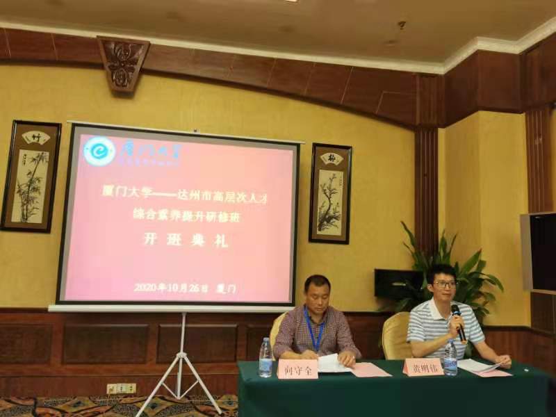 我院黄明伟副院长、达州市人力资源和社会保障局四级调研员向守全亲自出席了开班典礼。黄明伟在致辞中详细介绍了厦门大学的发展历史与现状,希望通过依托我校优势学科资源和继续教育学院长期积累的办学经验,助力学员们工作更上一层楼。向守全在开班动员讲话中,特别强调了在培训期间的纪律要求,并对继续教育学院的支持表示感谢。