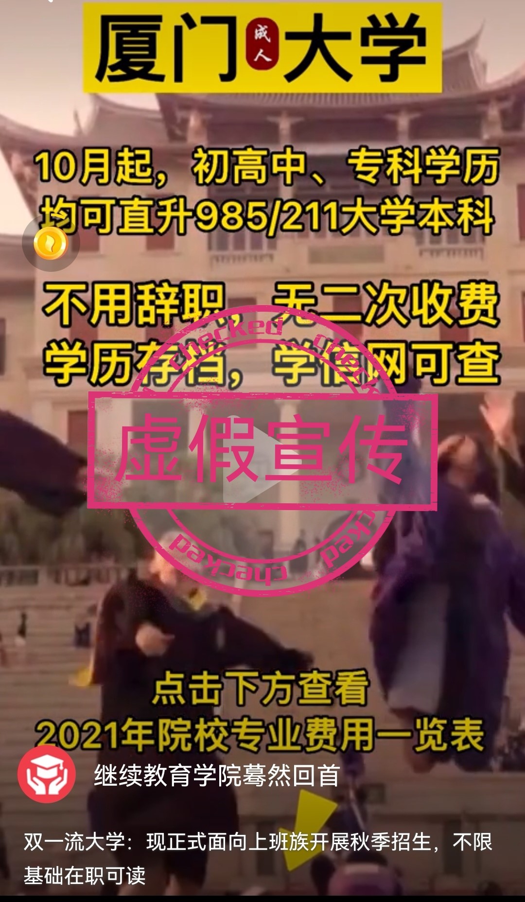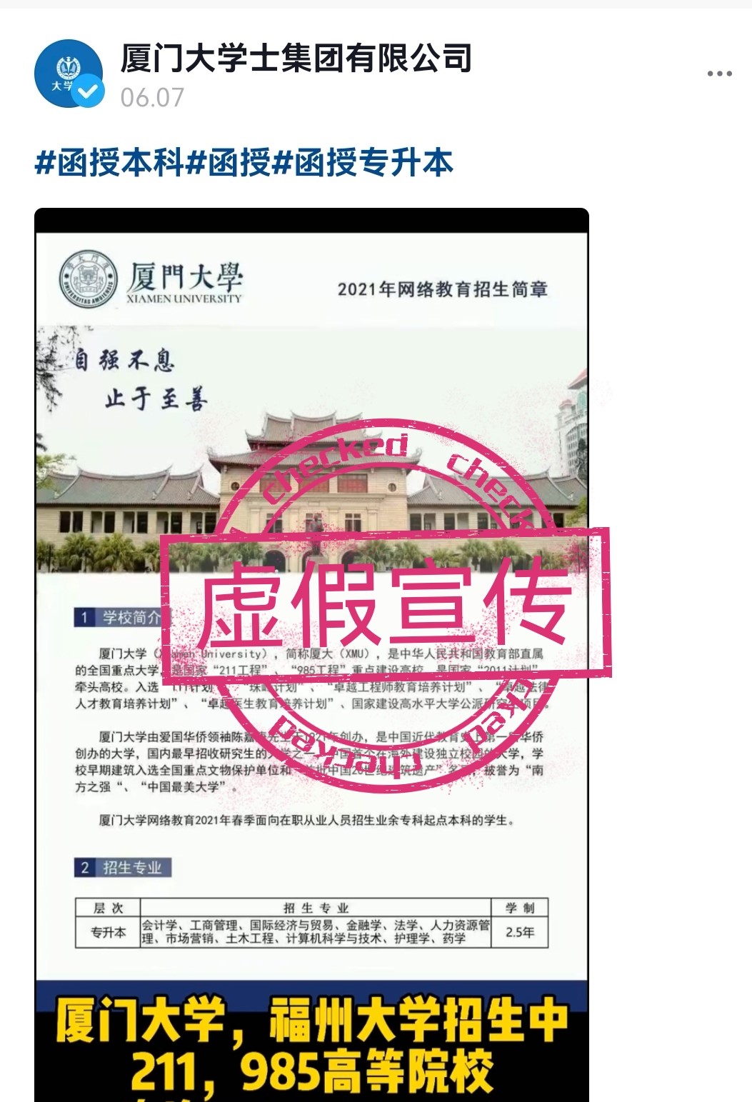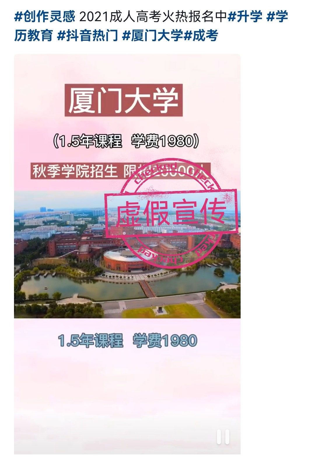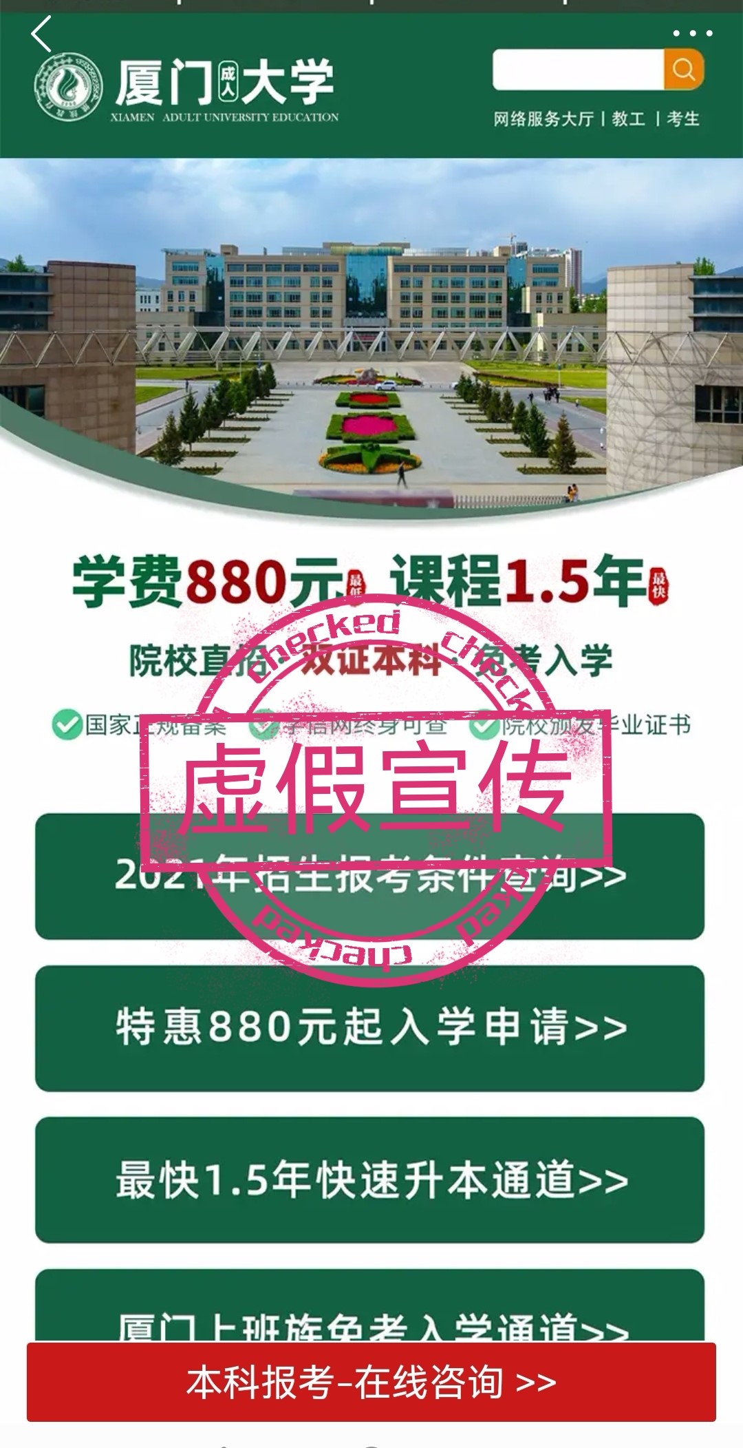 近日,社会上部分机构或个人通过抖音、今日头条、百度、淘宝等互联网媒介,冒用“厦门大学”“厦门大学继续教育学院”名义,使用“厦门大学”专有字体、“厦门大学继续教育学院”名称,发布招生宣传虚假信息,误导社会公众,影响厦门大学继续教育学院(以下简称学院)办学声誉。为维护学院办学秩序,特声明如下: