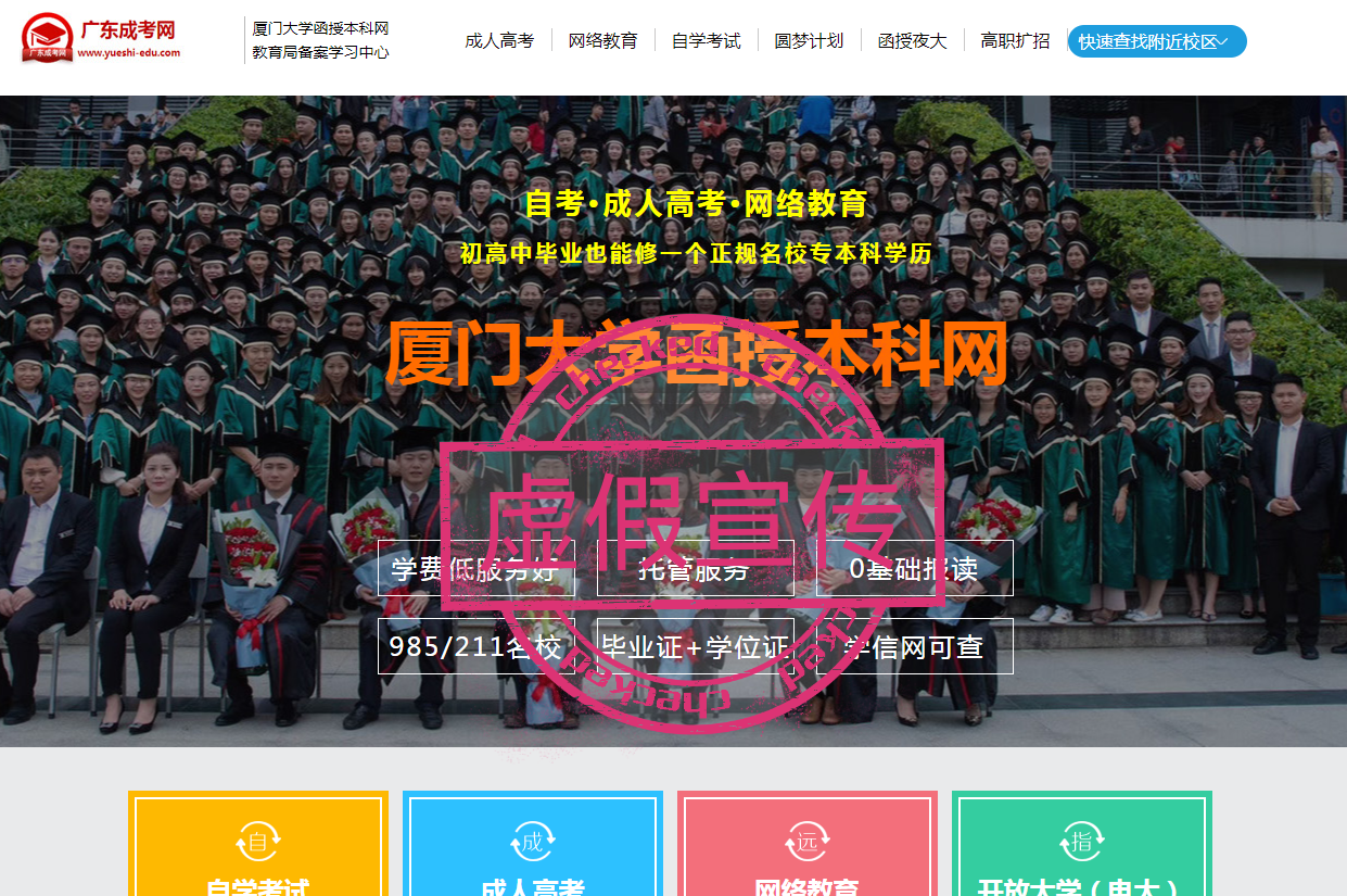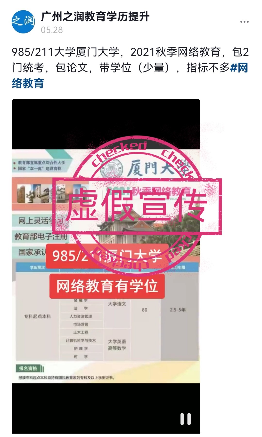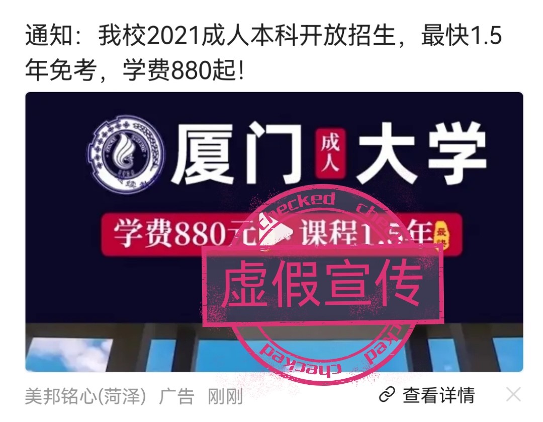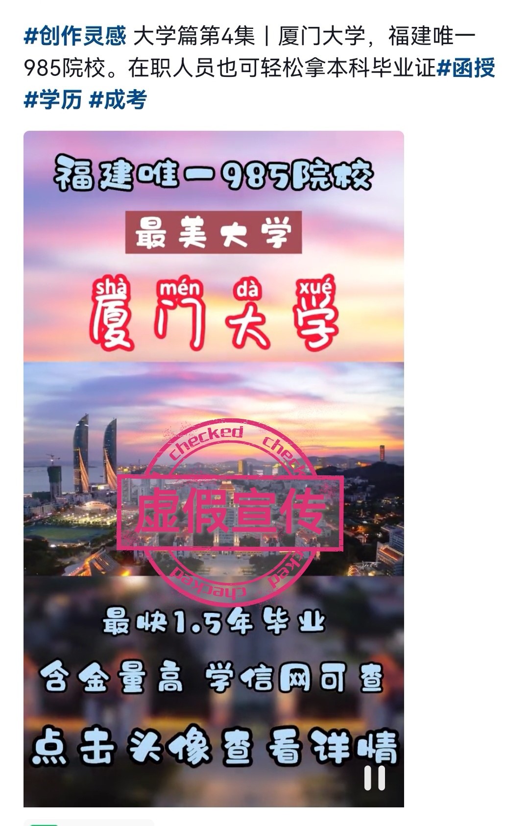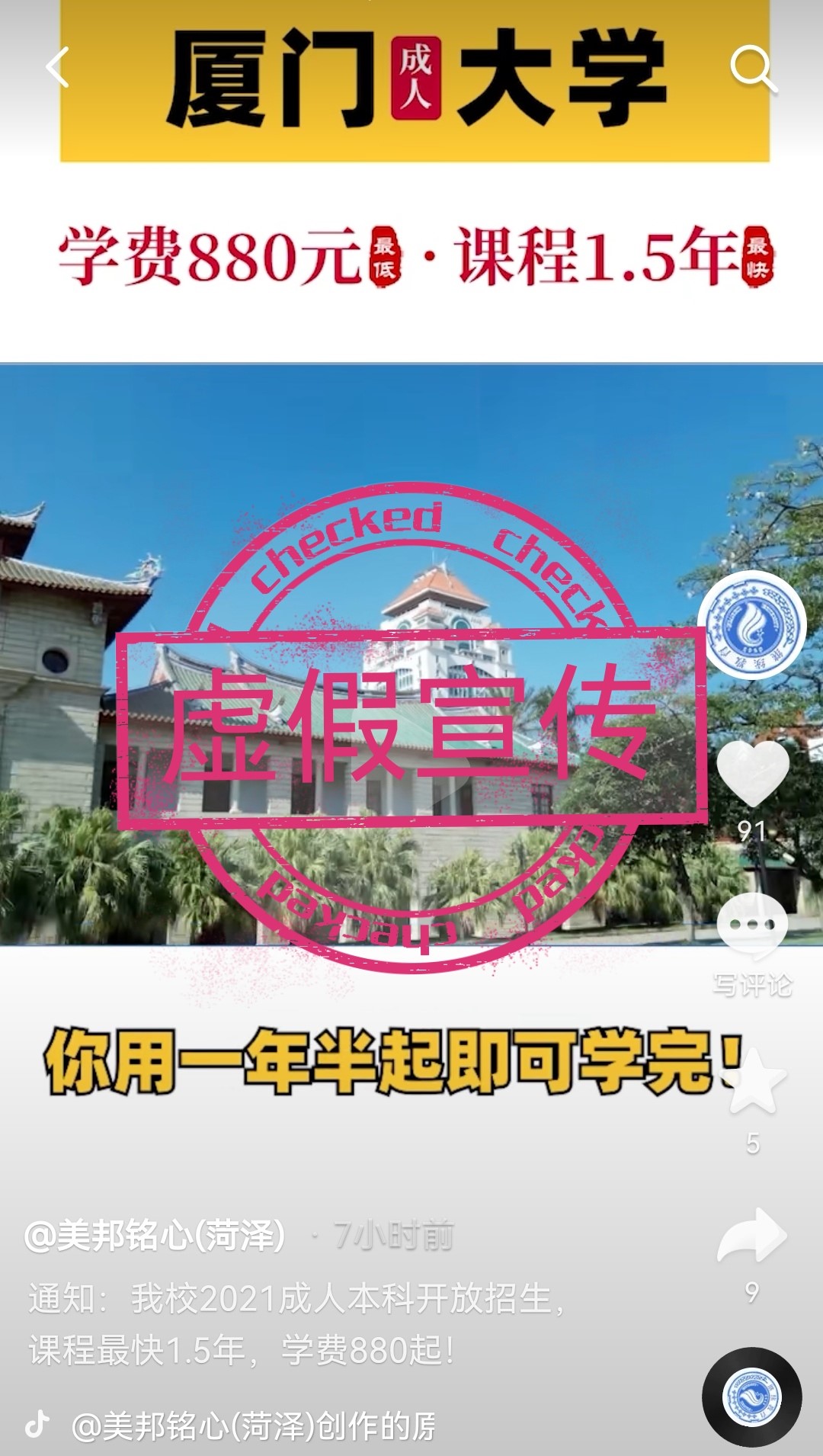 近日,社会上部分机构或个人通过抖音、今日头条、百度、淘宝等互联网媒介,冒用“厦门大学”“厦门大学继续教育学院”名义,使用“厦门大学”专有字体、“厦门大学继续教育学院”名称,发布招生宣传虚假信息,误导社会公众,影响厦门大学继续教育学院(以下简称学院)办学声誉。为维护学院办学秩序,特声明如下: